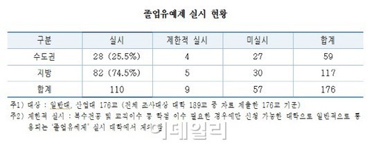 대학교육연구소(소장 박거용)가 정보공개 신청을 통해 교육부의 ‘대학 졸업 유예제 실태조사’ 내용을 받아 본 결과 2014년 7월 현재 졸업 유예제를 도입한 대학은 전국 176곳 중 110곳(62.5%)이다. 이 가운데 지방대학이 74.5%(82곳)를, 수도권 대학은 25.5%(28곳)를 차지했다. 취업에 필요한 ‘스펙(학벌·학점·토익·어학연수·자격증)’에서 상대적으로 불리한 지방대생들 사이에서 졸업을 미루려는 수요가 더 많기 때문이다.