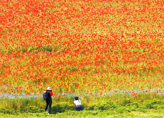 양귀비로 붉게 물든 경기도 안성 한경대학교 부속농장. 양귀비 절정기는 오는 20일 즈음부터 6월 초까지다. 사진은 week&이 2011년 6월 초순 포착한 모습이다.