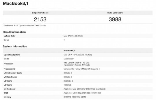 맥북은 무소음 노트북을 실현하기 위해 인텔 코어 M 프로세서(브로드웰)를 탑재했다. 어떤 프로세서를 탑재했는지 애플이 구체적으로 공개하지는 않는다. 다만 기크벤치3를 통해 확인해보니 하위 모델의 경우 인텔 코어M-5Y31 프로세서를 탑재하고 있는 것으로 확인됐다. 벤치마크 점수는 싱글 코어 2153점, 듀얼 코어 3988점으로 나타났다. 인텔 코어M-5Y31 프로세서는 인텔 코어 i5-4200U(하스웰 저전력), 인텔 코어 i7-720QM(린필드 쿼드코어 모바일), 인텔 코어2 쿼드 Q8200(코어 시리즈 쿼드코어 데스크톱)과 대등한 성능을 갖추고 있는 것. 태블릿PC에 사용되는 아톰, ARM 모바일 프로세서보다 성능이 월등하다.